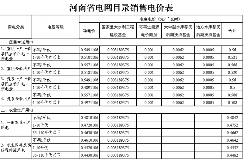 二、自2021年10月15日起,全面取消工商業(yè)目錄銷售電價(jià),僅保留居民生活、農(nóng)業(yè)生產(chǎn)目錄銷售電價(jià),調(diào)整后的河南省電網(wǎng)目錄銷售電價(jià)見(jiàn)附件1。執(zhí)行兩部制電價(jià)的工商業(yè)用戶,基本電價(jià)仍按國(guó)家現(xiàn)行有關(guān)規(guī)定執(zhí)行。