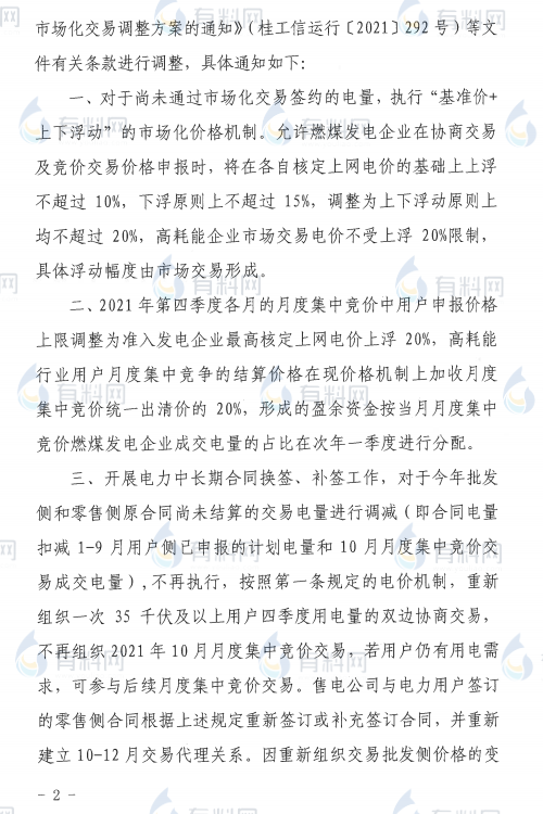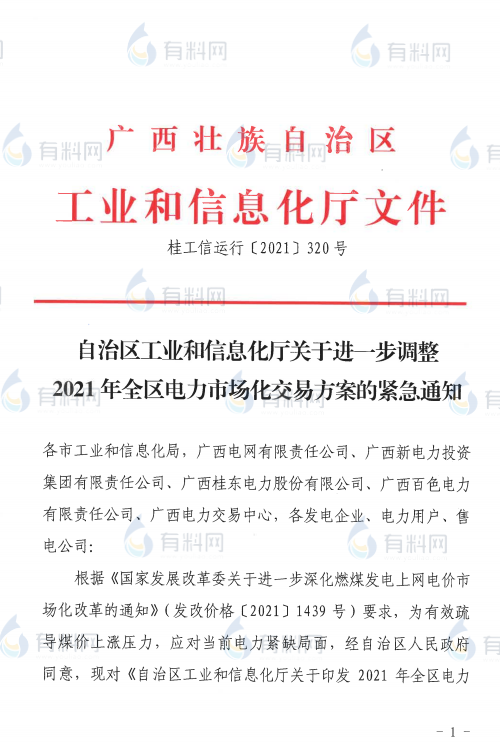 廣西發(fā)布《自治區(qū)工業(yè)和信息化廳關(guān)于進(jìn)一步調(diào)整2021年全區(qū)電力市場(chǎng)化交易方案的緊急通知》,在緊急通知中,高耗能企業(yè)電價(jià)直接上浮50%進(jìn)行結(jié)算。