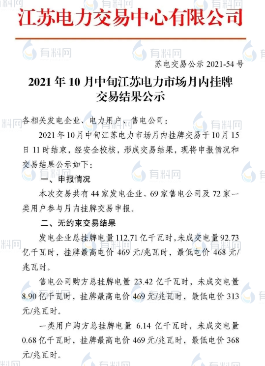 江蘇組織開(kāi)展了10月中旬月內(nèi)掛牌交易,共成交電量19.98億千瓦時(shí),成交均價(jià)468.97元/兆瓦時(shí),成交價(jià)較基準(zhǔn)價(jià)上浮了19.94%。