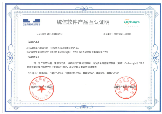 近日,遠(yuǎn)光軟件自主研發(fā)的分析型軟件產(chǎn)品資金智能監(jiān)控軟件CashInsightV2.0與國產(chǎn)操作系統(tǒng)廠商統(tǒng)信軟件推出的統(tǒng)信桌面操作系統(tǒng)V20完成產(chǎn)品兼容互認(rèn)證。測試結(jié)果表明,CashInsight V2.0在功能、兼容性方面整體運(yùn)行穩(wěn)定,滿足認(rèn)證要求。標(biāo)志著遠(yuǎn)光軟件在支持國產(chǎn)軟件兼容適配方面再下一城,支撐能力不斷加強(qiáng)。