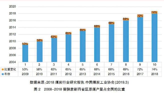 在供給側(cè)結(jié)構(gòu)性改革政策的推動下,煤炭產(chǎn)能集中度進一步提高。十八大以來,國務(wù)院相繼出臺了關(guān)于深化煤炭市場化改革的一系列文件,增大了煤炭去產(chǎn)能力度,截至到2018年底,基本上提前完成了“十三五”煤炭去產(chǎn)能8億噸的計劃,淘汰關(guān)閉了一大批不合標準的煤礦。同時,為了滿足日益增長的能源市場需要,新建、擴建、技改一批現(xiàn)代化礦井,產(chǎn)能已達到14.96億噸。據(jù)中國煤炭工業(yè)協(xié)會統(tǒng)計,全國煤礦數(shù)量從2015年的1.08萬處減少到目前的5800處,年產(chǎn)能120萬噸及以上的大型煤礦產(chǎn)量超過80%,年產(chǎn)能30萬噸及以下小型煤礦減少至10%以下。煤炭開采向大型煤炭基地集中,其產(chǎn)量占全國總產(chǎn)量的95%以上,5000萬噸級以上大型礦井產(chǎn)量占60%以上。煤炭生產(chǎn)布局進一步向晉、陜、蒙、新地區(qū)等地區(qū)集中。2018年,內(nèi)蒙古、山西、陜西、新疆、貴州、山東、河南、安徽等8個億噸級規(guī)模以上企業(yè)原煤產(chǎn)量達31.2億噸,占全國的88.1%,其中,晉、陜、蒙、新四省(區(qū))原煤產(chǎn)量占全國的74.3%。見圖1、圖2。