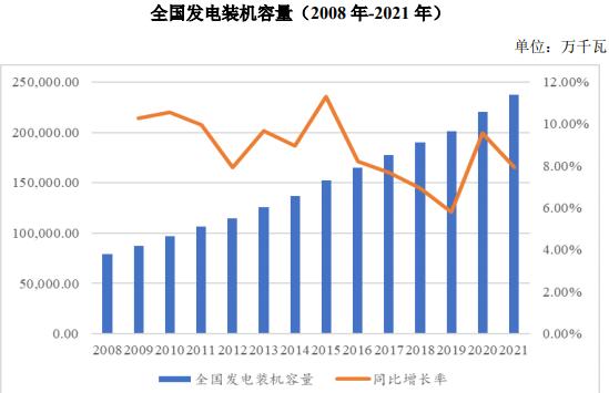 近年來,我國發(fā)電裝機容量持續(xù)增長,風電、核電以及太陽能發(fā)電等裝機規(guī)模增速較快。根據(jù)中電聯(lián)的統(tǒng)計,截至 2021 年底,全國發(fā)電裝機容量 237,692萬千瓦,同比增長 7.9%。其中,火電 129,678 萬千瓦,同比增長 4.1%;水電 39,092萬千瓦,同比增長 5.6%;風電 32,848 萬千瓦,同比增長 16.6%;核電 5,326 萬千瓦,同比增長 6.8%;太陽能發(fā)電 30,656 萬千瓦,同比增長 20.9%。