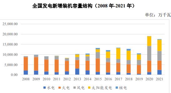 從總量和增速上看,近年來全國發(fā)電裝機容量逐年增長。2021 年,全國新增發(fā)電裝機容量 17,908 萬千瓦,比上年少投產(chǎn) 1,236 萬千瓦。其中火電新增 4,939萬千瓦(煤電為 2,937 萬千瓦,氣電為 771 萬千瓦),比上年下降 12.7%;核電新增 340 萬千瓦,比上年增長 203.9%;風電新增 4,765 萬千瓦,比上年下降 33.9%;太陽能發(fā)電新增 5,454 萬千瓦,比上年增長 13.1%。