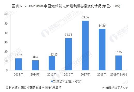 我國太陽能光伏行業(yè)雖起步較晚,但發(fā)展迅速,尤其是2013年以來,在國家及各地區(qū)的政策驅(qū)動下,太陽能光伏發(fā)電在我國呈現(xiàn)爆發(fā)式增長,據(jù)國家能源局統(tǒng)計數(shù)據(jù)顯示,2017年,我國光伏發(fā)電新增裝機(jī)容量為53.06GW,創(chuàng)歷史新高,2018年,受光伏531新政影響,各地光伏發(fā)電新增項目有所下滑,全年新增裝機(jī)容量為44.26GW,同比下降16.6%。截至2019年9月底,全國光伏發(fā)電新增裝機(jī)15.99GW。