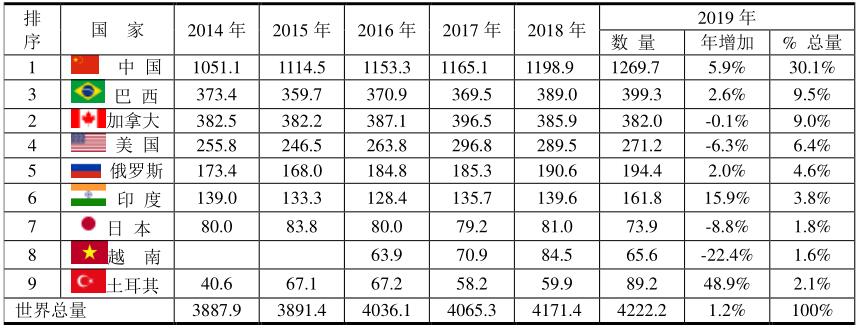 根據(jù)BP 2020的報(bào)告,中國(guó)水力發(fā)電量居世界之首,2019年占全球水力發(fā)電量的1269.7/4222.2=30.1%;其次為巴西、加拿大。