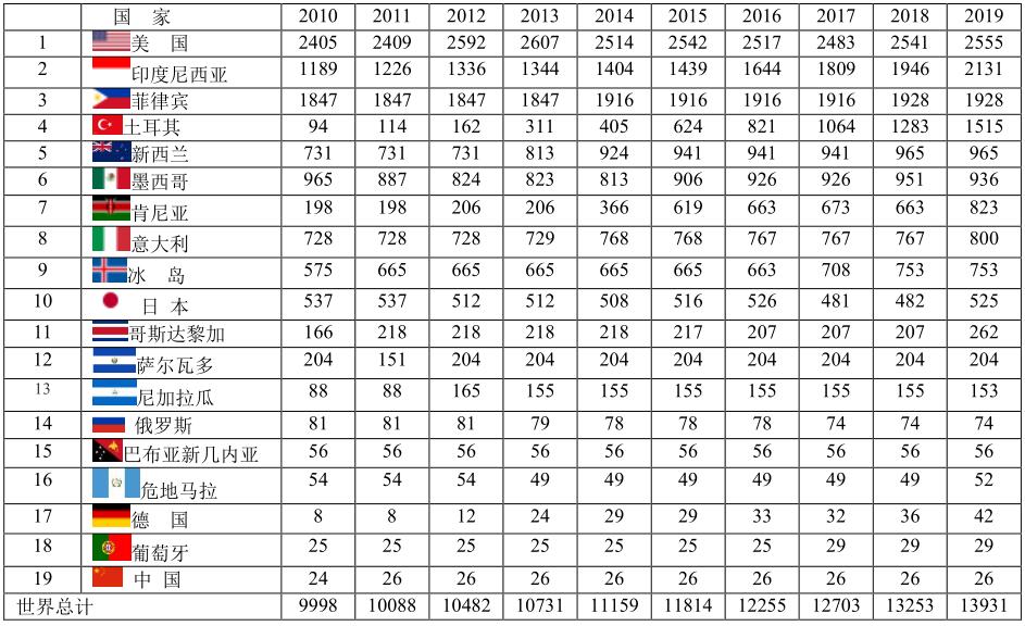 2019年占地?zé)嵫b機總?cè)萘孔疃嗟氖敲绹?18.3%)、印度尼西亞(15.3%)、菲律賓(13.8%)、土耳其(10.9%)、新西蘭(6.9%)。中國排序第19名,地?zé)嵫b機容量進(jìn)展不大。