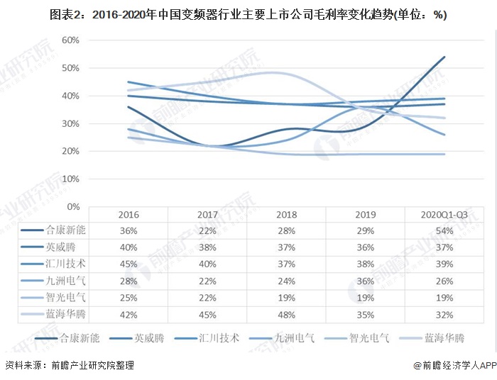 從我國(guó)上市公司近幾年的毛利率變化來看,變頻器行業(yè)主要上市公司的毛利率略有下降,但是整個(gè)行業(yè)的獲利水平較高,經(jīng)營(yíng)效益良好。2018年,6家上市公司的毛利率維持在20%-50%之間;2019年,各公司的毛利率差異進(jìn)一步縮小,集中在30%-40%之間。2020年前三個(gè)季度,各公司的毛利率依然多集中在30%-40%之間。