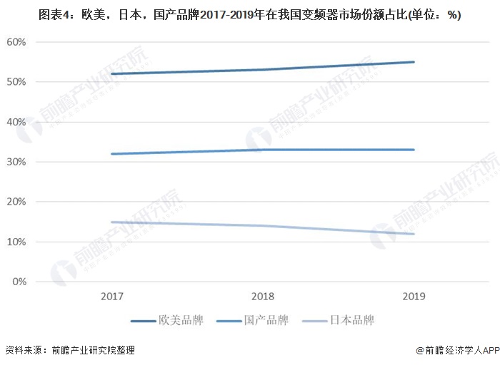 而中國(guó)國(guó)產(chǎn)變頻器企業(yè)這幾年市場(chǎng)份額一直在逐年增加。從各品牌的市場(chǎng)份額來看,外資品牌占據(jù)變頻器市場(chǎng)的主要份額,上世紀(jì)80年代日本企業(yè)率先進(jìn)入我國(guó)的變頻器市場(chǎng),之后歐美品牌大量涌入,形成了歐美與日本品牌共同主導(dǎo)我國(guó)變頻器市場(chǎng)的競(jìng)爭(zhēng)格局。近年來,進(jìn)口替代進(jìn)程正在不斷推進(jìn),國(guó)產(chǎn)企業(yè)正在逐步占據(jù)日本企業(yè)市場(chǎng)份額。從2017年至2019年日本變頻器行業(yè)市場(chǎng)份額逐年下降,國(guó)產(chǎn)品牌的上升且維持在33%左右,歐美品牌則依舊是變頻器市場(chǎng)份額占比最高的。2019年,歐美品牌市場(chǎng)份額占比為55%,國(guó)產(chǎn)品牌市場(chǎng)份額占比為33%,日本品牌的市場(chǎng)份額占比為12%。