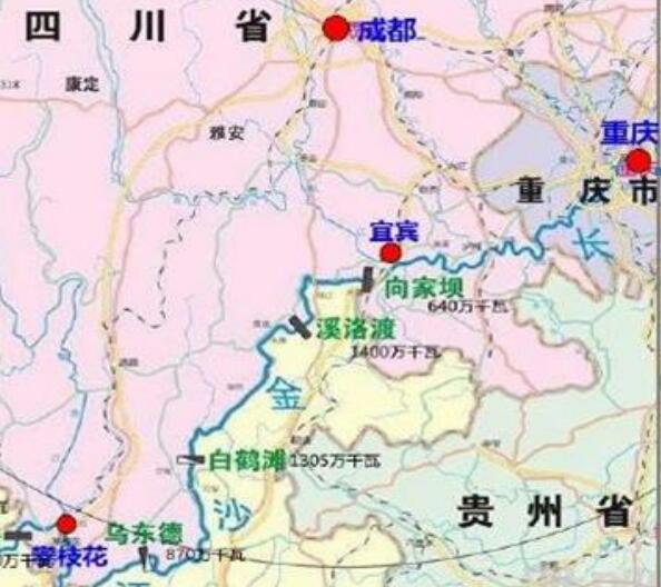 ▲ 四川長江-金沙江段修建了四座世界級的水電站:向家壩、溪洛渡、白鶴灘、烏東德。這四座水電站裝機總?cè)萘窟_(dá)46508MW,為三峽水電站裝機容量22500 MW的46508/22500=2.07倍。