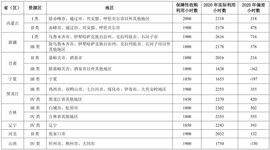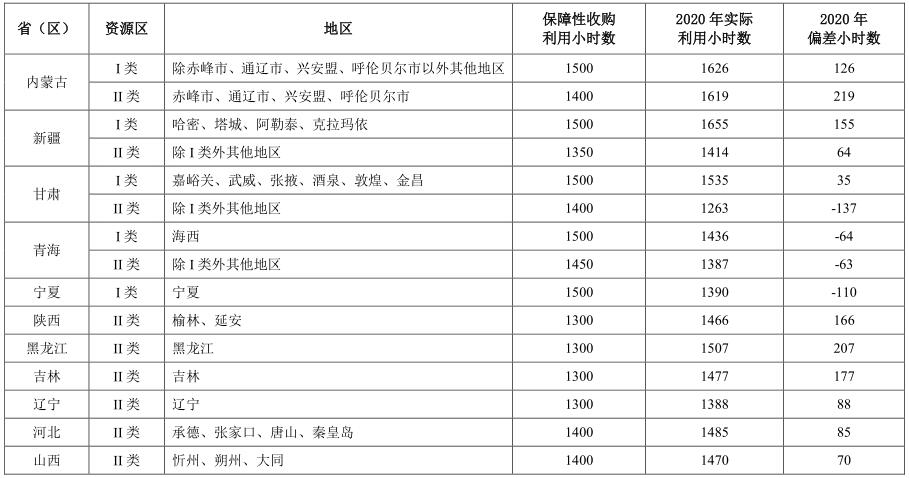 表3 2020年風(fēng)電重點(diǎn)地區(qū)最低保障收購(gòu)年利用小時(shí)數(shù)落實(shí)情況