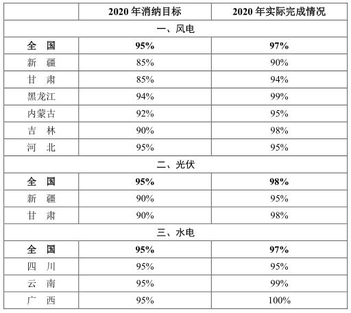 根據(jù)2018年國(guó)家發(fā)展改革委、國(guó)家能源局印發(fā)的《清潔能源消納行動(dòng)計(jì)劃(2018-2020年)》(發(fā)改能源規(guī)〔2018〕1575號(hào)),所確定的分年度風(fēng)電、光伏和水電消納目標(biāo),2020年全國(guó)平均風(fēng)電利用率97%,超過2020年風(fēng)電利用率目標(biāo)2個(gè)百分點(diǎn),重點(diǎn)省區(qū)全部達(dá)到了2020年消納目標(biāo);全國(guó)平均光伏發(fā)電利用率為98%,超過2020年利用率目標(biāo)3個(gè)百分點(diǎn),重點(diǎn)省區(qū)全部達(dá)到了2020年消納目標(biāo);全國(guó)主要流域水能利用率97%,超過2020年利用率目標(biāo)近2個(gè)百分點(diǎn),重點(diǎn)省區(qū)全部達(dá)到了2020年消納目標(biāo)。