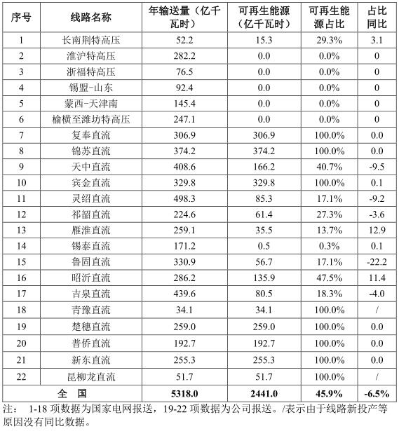 2020年,22條特高壓線路年輸送電量5318億千瓦時(shí),其中可再生能源電量2441億千瓦時(shí),同比提高3.8%,可再生能源電量占全部輸送電量的45.9%。國(guó)家電網(wǎng)運(yùn)營(yíng)的18條特高壓線路輸送電量4559億千瓦時(shí),其中可再生能源電量1682億千瓦時(shí),占輸送電量的37%;南方電網(wǎng)運(yùn)營(yíng)的4條特高壓線路輸送電量759億千瓦時(shí),全部為可再生能源電量。