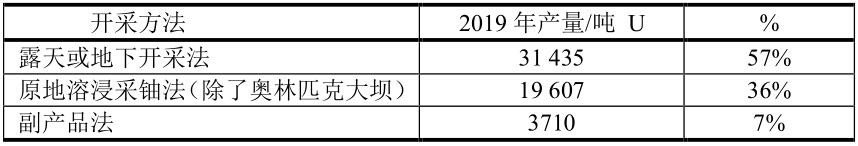 鈾礦開(kāi)采方式一直在改變。1990 年,世界鈾產(chǎn)量的有55% 來(lái)自地下礦山,但到 1999 年這一比例急劇下降,當(dāng)時(shí)只有 33%。從 2000 年開(kāi)始,加拿大新礦山采用原位浸出(ISL,也稱為原位回收,ISR),采礦在總量中的份額一直在穩(wěn)步上升,主要是由于哈薩克斯坦,2019年占產(chǎn)量的一半以上: