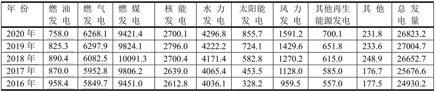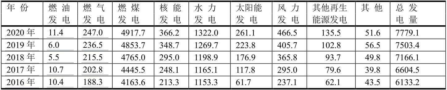 就中國發(fā)電而論,2020年燃煤發(fā)電居首位,占中國發(fā)電總量的4917.7/7779.1=63.2%;其次為水力發(fā)電、風(fēng)力發(fā)電、核能發(fā)電和太陽能發(fā)電。盡管中國燃氣發(fā)電量居世界第三位,但在中國發(fā)電總量中居第六位247.0/7779.1=3.2%。