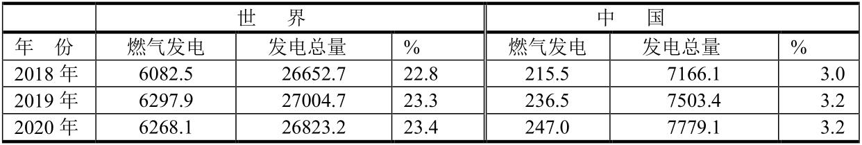 世界與中國燃氣發(fā)電的比較(單位:TWh)