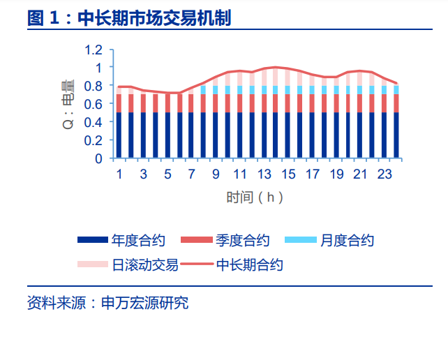 如果把上述五個(gè)方向繼續(xù)向下展開,涉及到的品種多達(dá)十幾種,紛繁復(fù)雜的電力交易 品種以及各不相同的機(jī)制提高了對(duì)電力市場研究的門檻。但從電力系統(tǒng)運(yùn)行的本質(zhì)來說, 不論是電能量市場、輔助服務(wù)市場還是容量電價(jià),大體上都是要實(shí)現(xiàn)兩個(gè)功能:有功平衡 和無功平衡。 有功平衡即電力系統(tǒng)需要保持發(fā)電功率和用電負(fù)荷時(shí)時(shí)刻刻相等。為了保證供電的可 靠性以及用電成本的穩(wěn)定性,用戶側(cè)需要提前安排和預(yù)測其未來的用電需求,發(fā)電側(cè)需要提前預(yù)測其未來出力情況(風(fēng)電、光伏、水電等)或安排發(fā)電計(jì)劃(化石能源),因此需 要提前簽訂用電合約來使供需平衡。但不論新能源的出力還是用電計(jì)劃,距離用電時(shí)間越 遠(yuǎn)把握性越小,所以根據(jù)簽訂合約時(shí)點(diǎn)與實(shí)際用電時(shí)點(diǎn)的遠(yuǎn)近,可以分為中長期和現(xiàn)貨交 易,本質(zhì)目的是對(duì)電力合約進(jìn)行分解,使得電力合約與實(shí)際用電需求盡量匹配。 中長期交易從時(shí)間尺度上可以分為年度合約、季度合約、月度合約等,現(xiàn)貨交易則主 要分為日前、日內(nèi)和實(shí)時(shí)現(xiàn)貨交易。將電能量市場根據(jù)時(shí)間尺度不同分解為不同的產(chǎn)品, 本質(zhì)上是在市場靈活性和交易成本之間取平衡,時(shí)間尺度越長靈活性越差,交易成本越低, 反之則靈活性越強(qiáng)但交易成本越高。