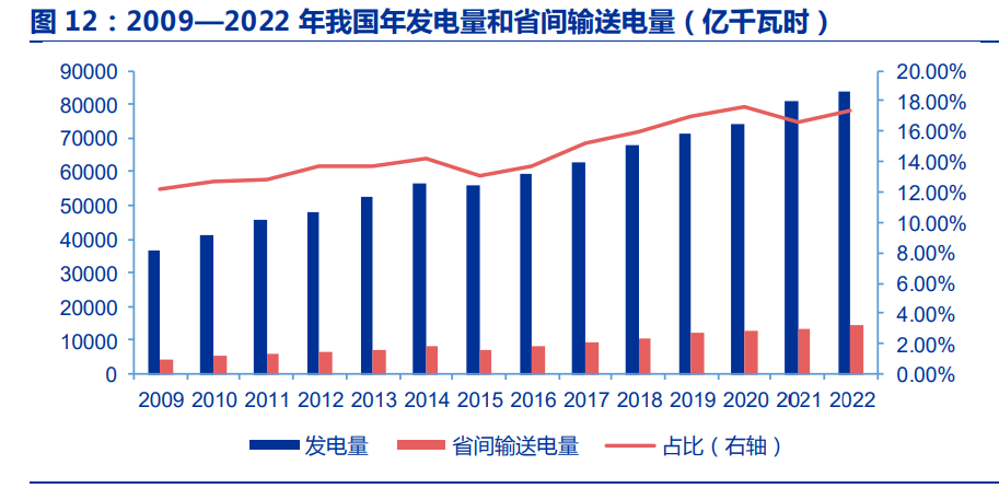 前面提到,由于歷史沿革原因,我國(guó)大陸地區(qū)除內(nèi)蒙古和河北外,每個(gè)省級(jí)行政區(qū)均 設(shè)有 1 個(gè)省級(jí)電網(wǎng),加上內(nèi)蒙古自治區(qū)的蒙東、蒙西和河北的冀北、河北南網(wǎng) 4 個(gè)省級(jí)電 網(wǎng),共有 33 個(gè)省級(jí)電網(wǎng),大部分電力的生產(chǎn)和消納均在省內(nèi)完成。我國(guó)跨省輸電電量穩(wěn)步 提升,從 2009 年的 4459 億千瓦時(shí)上升至 2022 年的 14610 億千瓦時(shí),增加約 3 倍,占 比也從 12.2%提升到 17.4%,2022 年全年發(fā)電量約 8.4 萬(wàn)億千瓦時(shí)。