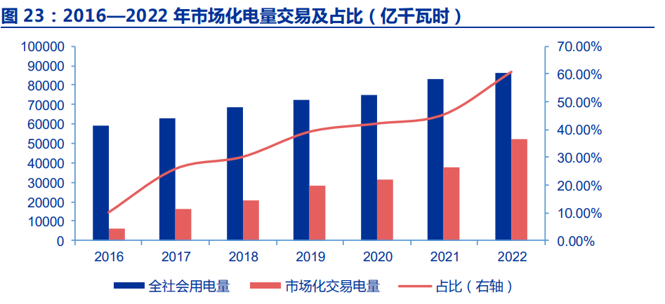電力交易業(yè)務(wù)是電力市場(chǎng)化最直接收益的業(yè)務(wù)。由于電力市場(chǎng)的設(shè)計(jì)復(fù)雜,各地交易 規(guī)則、品種不一,同時(shí)也要求對(duì)整個(gè)電力系統(tǒng)的運(yùn)行規(guī)律有深刻理解,是高度專業(yè)化的業(yè) 務(wù),電力交易決策本身對(duì)于電力市場(chǎng)參與者的收益造成較大影響。 市場(chǎng)化售電規(guī)模有快速擴(kuò)張潛力。根據(jù)中電聯(lián)相關(guān)數(shù)據(jù),2022 年我國(guó)市場(chǎng)化交易電量 規(guī)模達(dá)到 5.25 萬(wàn)億千瓦時(shí),占全社會(huì)總用電量的規(guī)模已超過(guò) 60%,考慮到優(yōu)先購(gòu)用電,直 觀看起來(lái)售電規(guī)模增長(zhǎng)空間有限。但實(shí)際上:(1)我國(guó)目前市場(chǎng)化交易電量大部分仍通過(guò) 電網(wǎng)代理購(gòu)電,直接購(gòu)電以及通過(guò)售電公司購(gòu)電比例較低;(2)我國(guó)電力現(xiàn)貨市場(chǎng)才開(kāi)始 推廣,雖然各地要求中長(zhǎng)期電量占比要達(dá)到 70%—90%以上,但由于絕大多數(shù)省份現(xiàn)貨市 場(chǎng)均采用全電量結(jié)算,因此實(shí)際的現(xiàn)貨交易量可能會(huì)接近全社會(huì)用電量。以廣東省為例, 2022 年全省本地機(jī)組發(fā)電量 5844 億千瓦時(shí),中長(zhǎng)期交易電量 2871 億千瓦時(shí),現(xiàn)貨市場(chǎng) 總交易量達(dá) 3801 億千瓦時(shí)。