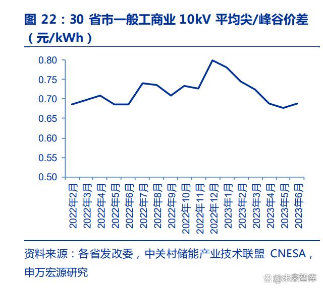 平均峰谷價差逐漸拉大,為工商業(yè)儲能套利提供可能性。2021 年 7 月 26 日,國家發(fā) 改委發(fā)布《關(guān)于進一步完善分時電價機制的通知》,各省響應(yīng)出臺拉大峰谷價差。根據(jù) CNESA 數(shù)據(jù),2022 年全國 30 省市平均峰谷價差已達到 0.70 元/kWh。自 2023 年以來, 峰 谷 價 差 進 一 步 拉 大 , 全 國 30 省 份 1-6 月 平 均 峰 谷 價 差 達 0.78/0.75/0.72/0.69/0.68/0.69 元每度,除 4 月和 5 月以外,其他月份峰谷價差較 2022 年均有所上漲。
