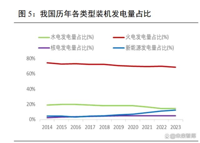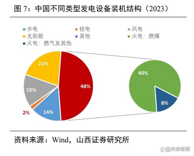 目前我國電力發(fā)電結(jié)構(gòu)仍以火電為絕對主力。截止 2023 年底,我國電力總裝機29.2億千瓦,火電、水電、核電、風(fēng)電及太陽能分別占比 47.62%、14.44%、1.95%、15.12%和20.88%;其中,燃煤火電占比 39.9%,風(fēng)能和太陽能合計占比 36%。從發(fā)電結(jié)構(gòu)來看,2023年我國規(guī)上發(fā)電設(shè)備總發(fā)電量 8.91 萬億千瓦時,火、水、核、風(fēng)、太陽能分別占比69.95%、12.81%、4.86%、9.08%、3.30%。