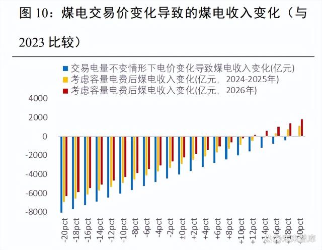 容量電價抬高了煤電機組收入底部預(yù)期,且隨著容量電價提高,煤電機組收入底部將繼續(xù)提升。我們測算的煤電機組收入底部至少抬高 5.54%(2024-2025 年)或8.86%(2026年)。假設(shè)煤電交易電量不變,煤電交易電價分別為基準(zhǔn)價 372 元/兆瓦時和298 元/兆瓦時(基準(zhǔn)價下浮 20%)時,煤電機組電量電費收入分別為 2.02 萬億元和 1.62 萬億元,較2023 年收入分別減少 16.67%和 33.24%;但考慮容量電費后,上述兩種交易電價下,煤電收入分別為2.13萬億元和 1.73 萬億元(2024-2025 年),底部抬高了 5.54%和 6.92%;2026 年及以后煤電收入分別為 2.20 萬億元和 1.80 萬億元,底部抬高了 8.86%和 11.07%。即容量電價推出后,煤電機組收入底部明顯抬升。