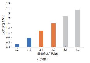 通過兩個方案進行燃料電池儲能經(jīng)濟性評估,均按容量為1 MW 的燃料電池計算,運行周期為10 年,固定資產(chǎn)殘值為10%,用氫量為83.5 t/ 年。其中,方案A 為燃料電池發(fā)電,年利用小時數(shù)為2000 h,轉(zhuǎn)化效率為60%,發(fā)電量為200 萬kWh;方案B 為燃料電池熱電聯(lián)供,年利用小時數(shù)為3000 h,轉(zhuǎn)化效率為90%,發(fā)電量為300 萬kWh。兩種方案的不同綠氫成本對應(yīng)的LCOE 如圖3 所示。