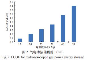按1 臺容量為50 萬kW 的燃氣機組100%摻氫計算,燃氣電站投資單價為2600 元/kW,增加儲氣設(shè)施的投資為3000 萬元,年利用小時數(shù)為3000 h,運行周期為20 年,固定資產(chǎn)殘值為10%。按等熱值換算后的燒氫量為7 萬t/ 年,發(fā)電量為15 億kWh,計算得到不同綠氫成本對應(yīng)的氣電摻氫儲能的LCOE,具體如圖2 所示。