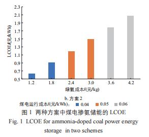 考慮煤電運行成本的影響( 煤電運行成本隨綠氨成本下降而下降),計算得到兩種方案中不同綠氨成本對應(yīng)的煤電摻氨儲能的LCOE,具體如圖1 所示。
